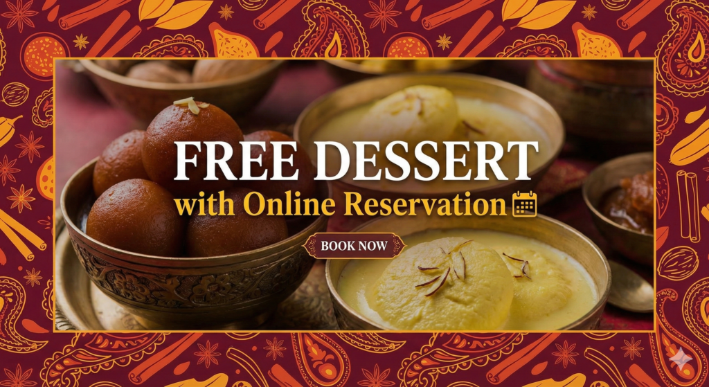 Reserveer vandaag online en ontvang een gratis Indiaas dessert bij uw maaltijd.